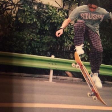 サーフィンから知ったスケートボードに夢中になりアキ秋山のもとで練習を重ね、第一回全日本スケートボード大会でボーイズクラスで優勝。カリフォルニア、デルマーの大会にてハーフパイプでボーイズで二位。(当時は子供のスケーターがいないので楽勝)